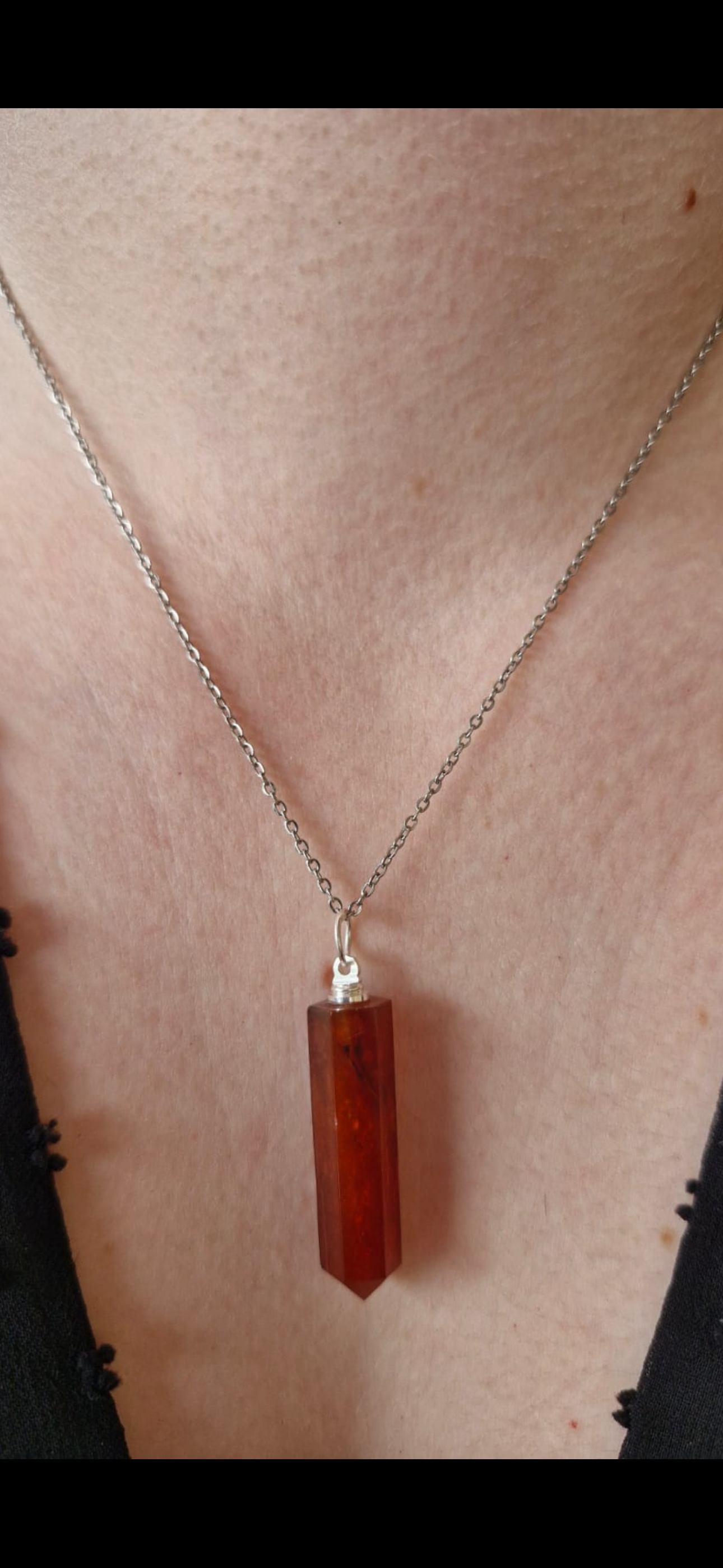 Ce collier composé d’une chaine en acier inoxydable et d’une pierre naturelle en Cornaline, taillée en pointe de 30 à 35 mm, est un bijou vibrant de chaleur, d’élan créatif et d’ancrage vital.