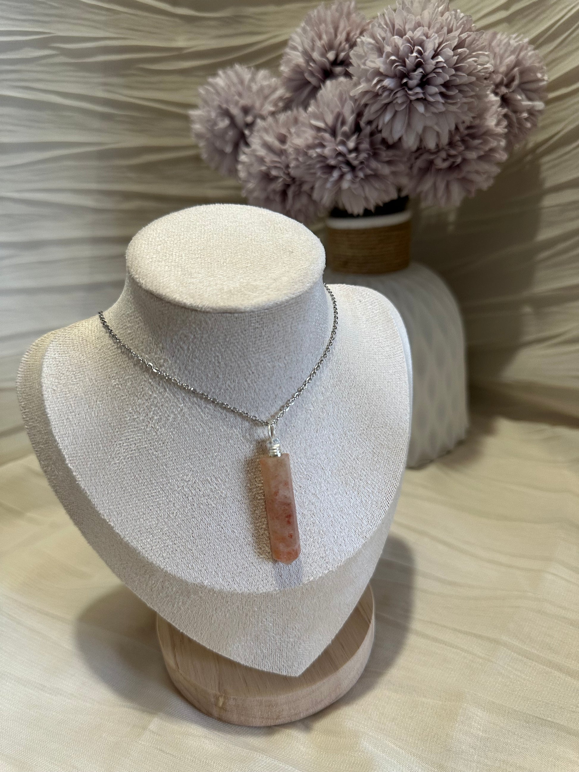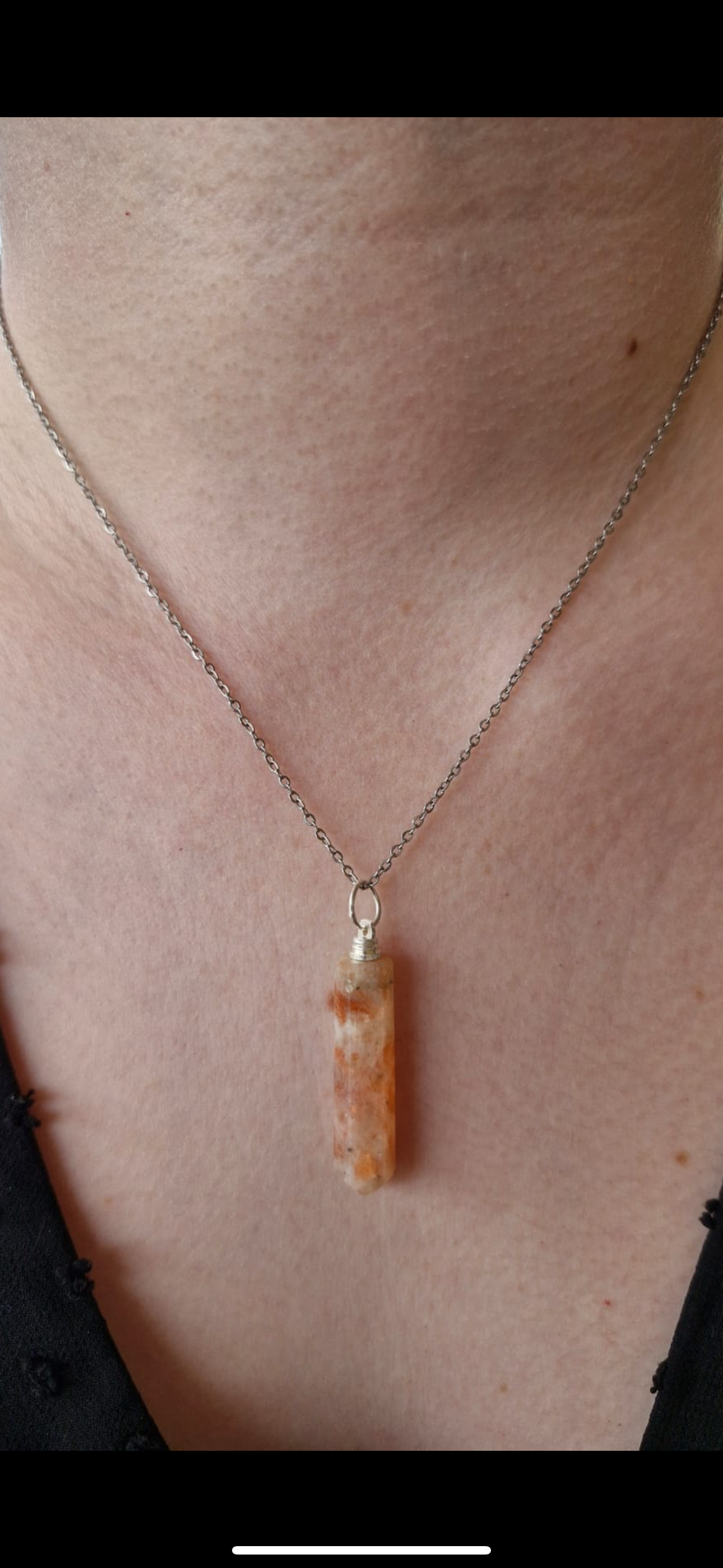 Ce collier composé d’une chaine en acier inoxydable et d’une pierre naturelle en Pierre de Soleil, taillée en pointe de 30 à 35 mm, est un bijou énergétique à porter près du cœur.