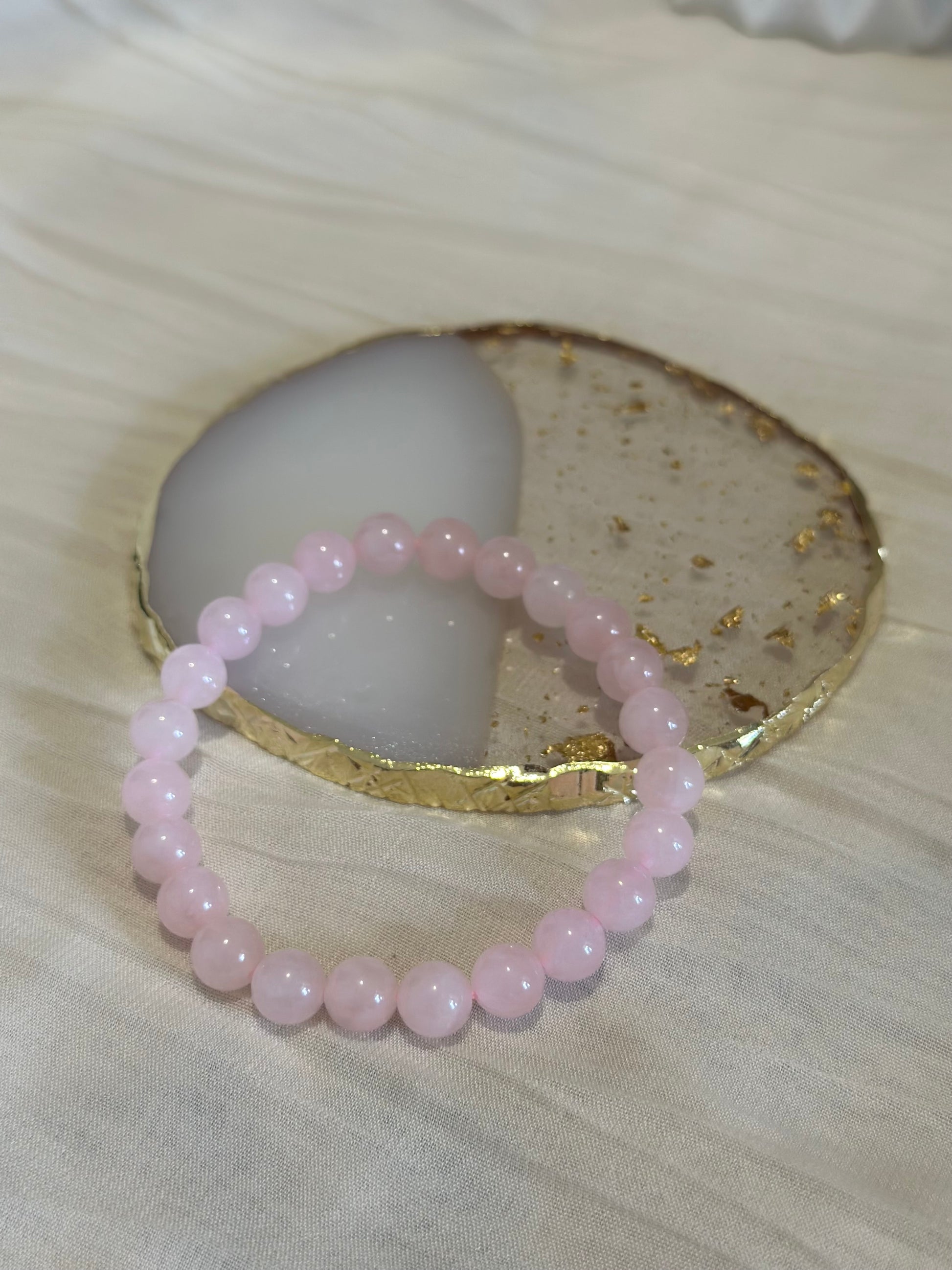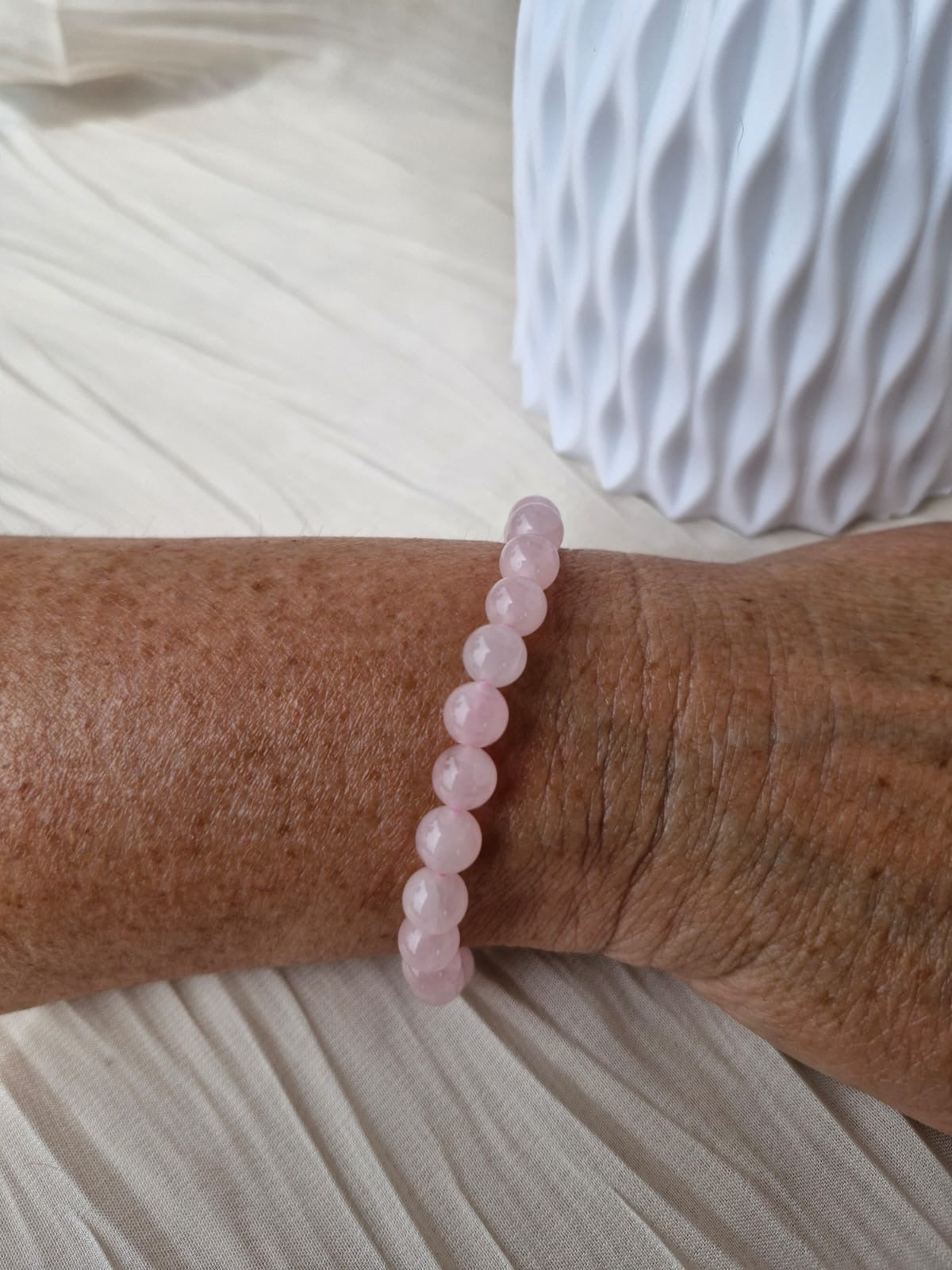 Ce bracelet est composé de perles de 8 mm en Quartz Rose, une pierre délicatement teintée de rose pâle à rose laiteux, parfois légèrement translucide.