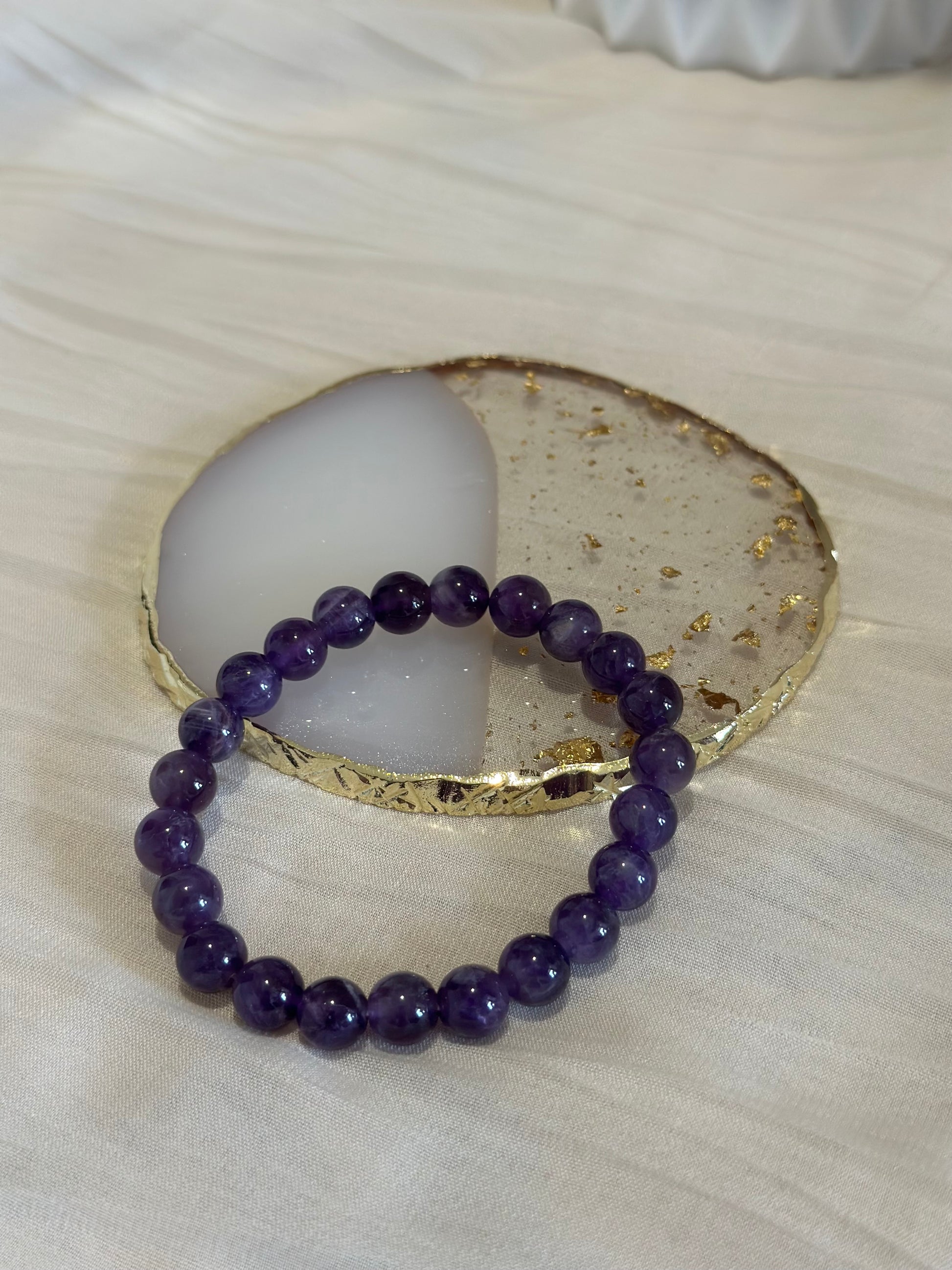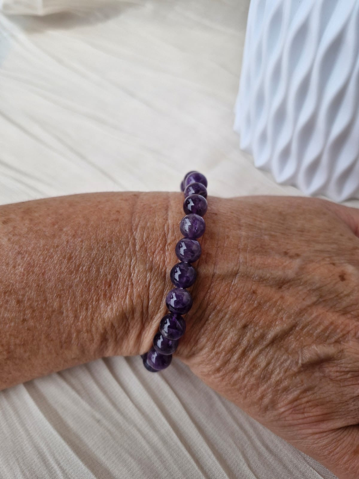Ce bracelet est composé de perles de 8 mm en Améthyste, une pierre d’un violet profond ou lavande claire, parfois légèrement translucide, marbrée ou uniforme selon les perles.