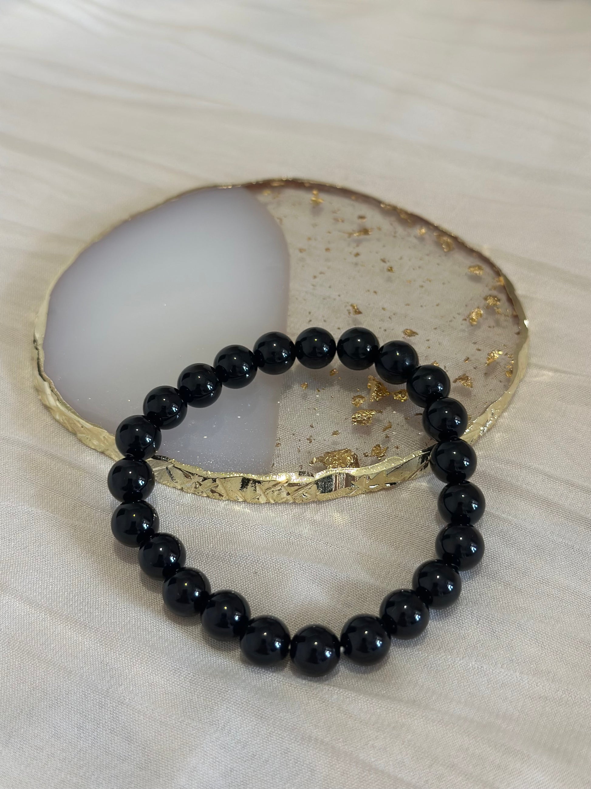 Ce bracelet est composé de perles de 8 mm en Onyx Noir, une pierre d’un noir profond et intense, au fini poli et brillant.