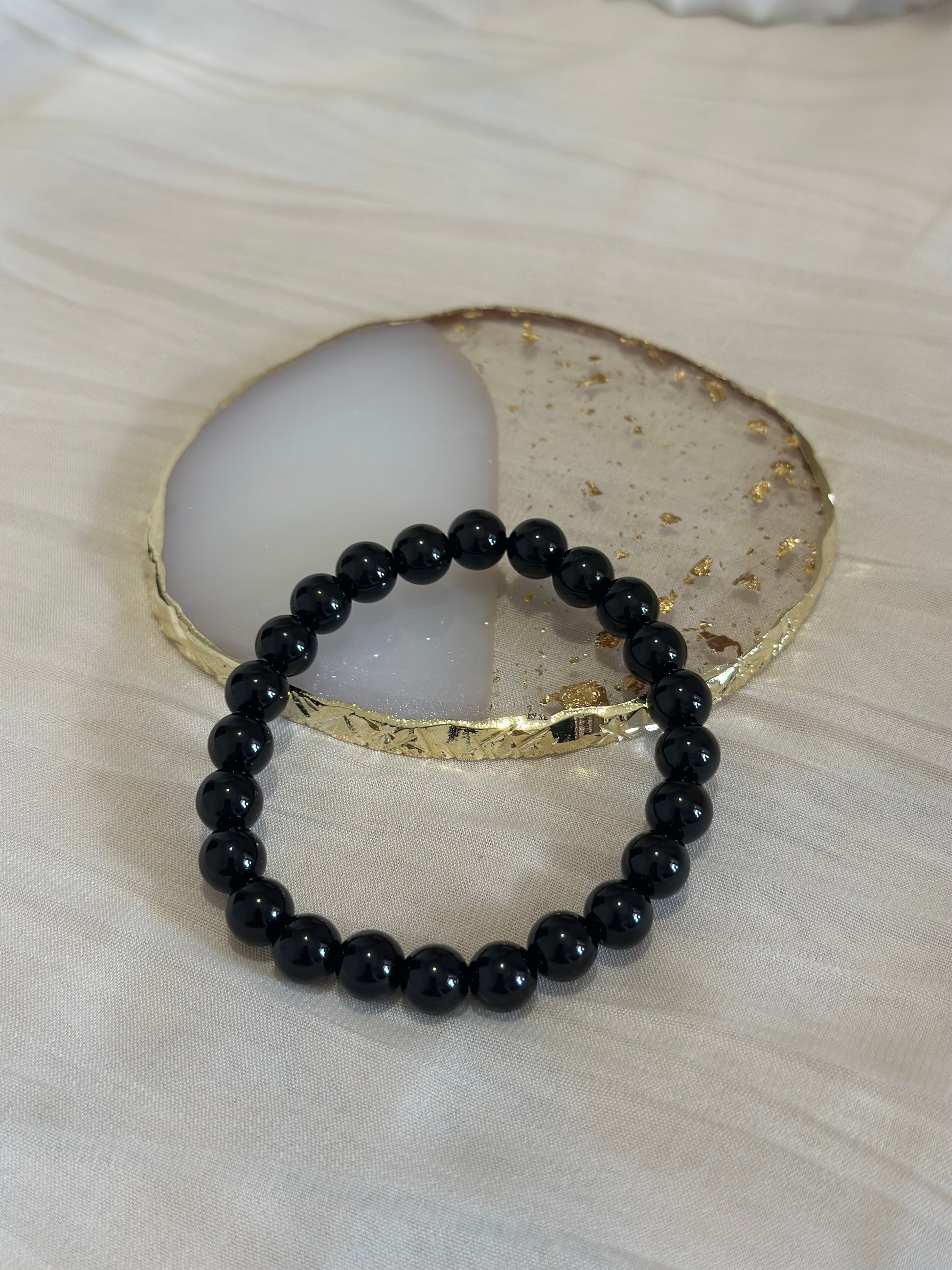 Ce bracelet est composé de perles de 8 mm en Obsidienne Noire, une pierre d’origine volcanique au noir profond et brillant, avec un fini lisse et vitreux.