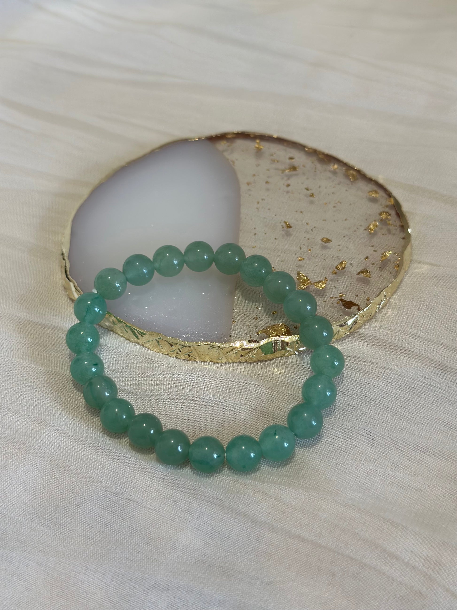 Ce bracelet est composé de perles de 8 mm en Aventurine Verte, une pierre aux teintes vert tendre à vert profond, parfois légèrement pailletée de mica.