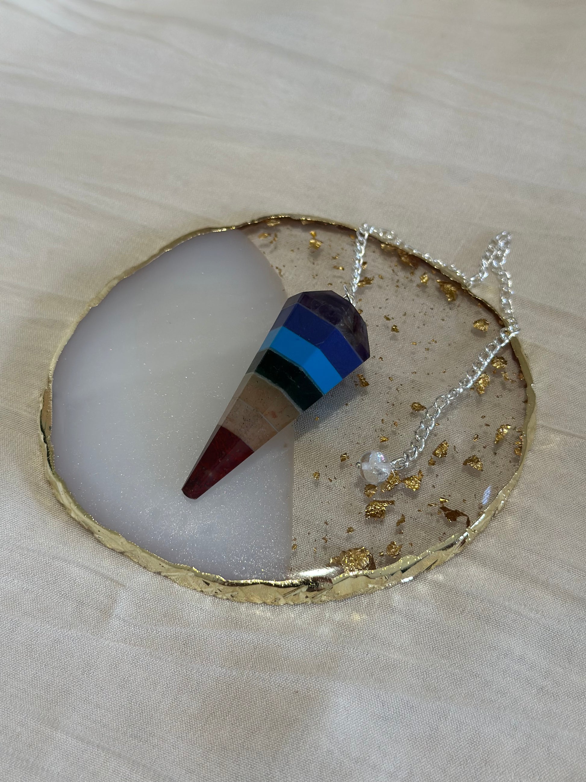 Ce pendule en pierres naturelles est conçu avec soin à partir de 7 pierres associées aux chakras principaux, assemblées en une forme hexagonale élégante et vibrante.