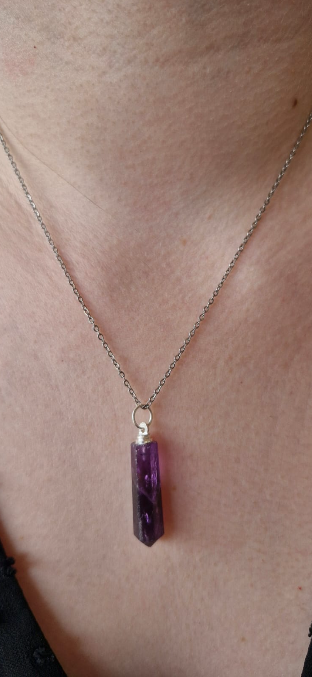 Ce collier composé d’une chaine en acier inoxydable et d’une pierre naturelle en Améthyste, taillée en pointe de 30 à 35 mm, est un bijou vibratoire idéal pour apaiser l’esprit, se recentrer et élever sa conscience.