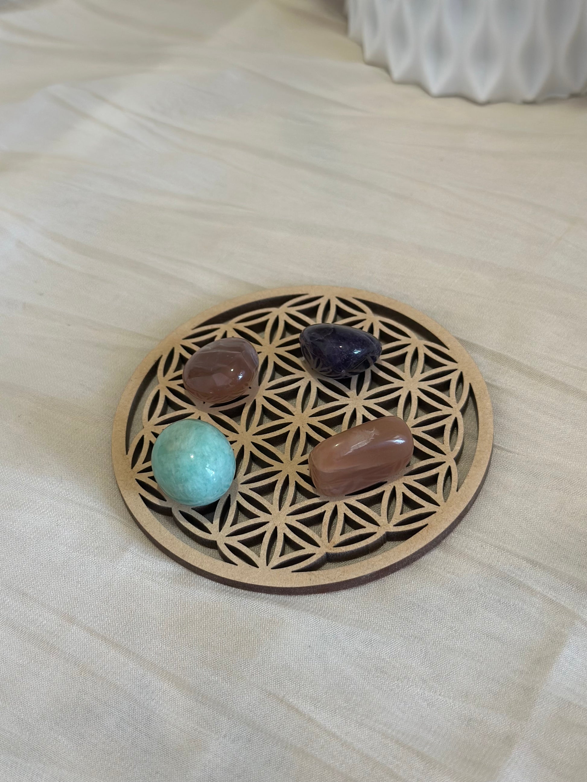 Cette plaque de rechargement en bois naturel, sculptée du symbole sacré de la Fleur de Vie, est un support énergétique puissant destiné à purifier et recharger les pierres, bracelets, pendules ou objets spirituels.