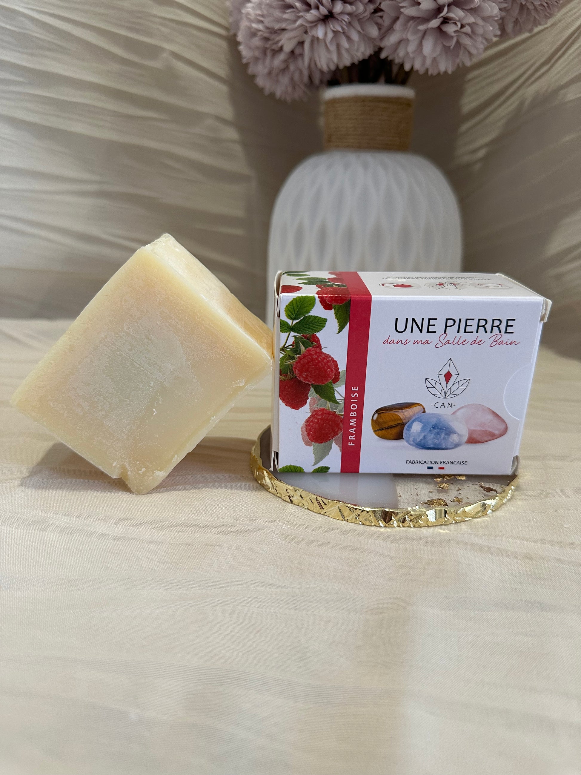 Offrez-vous un instant de douceur avec notre savon artisanal au parfum de framboise, contenant une véritable pierre roulée.